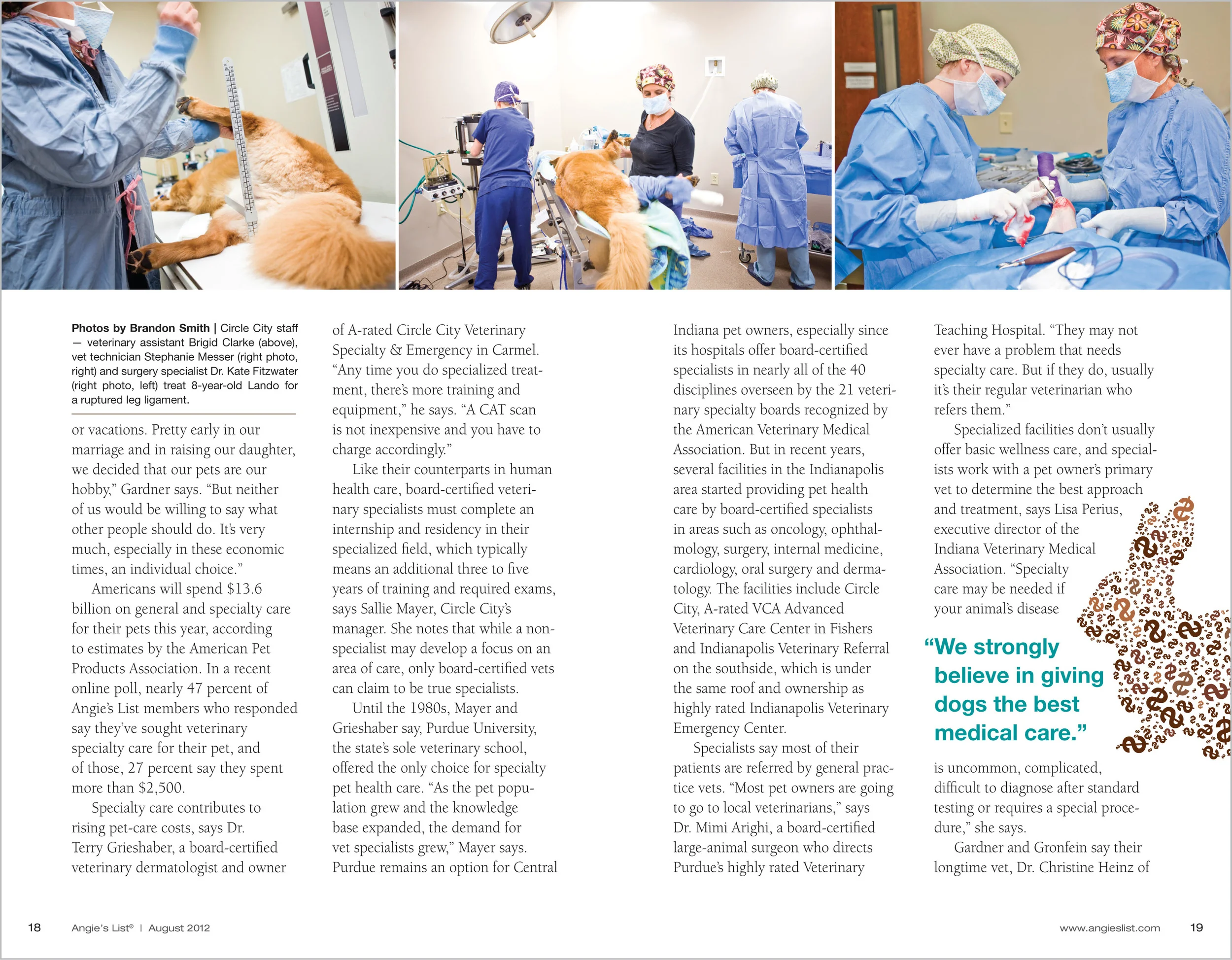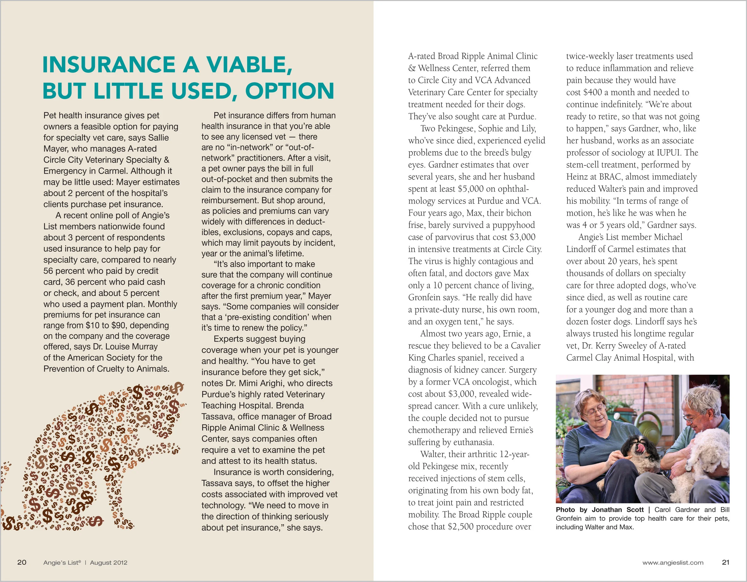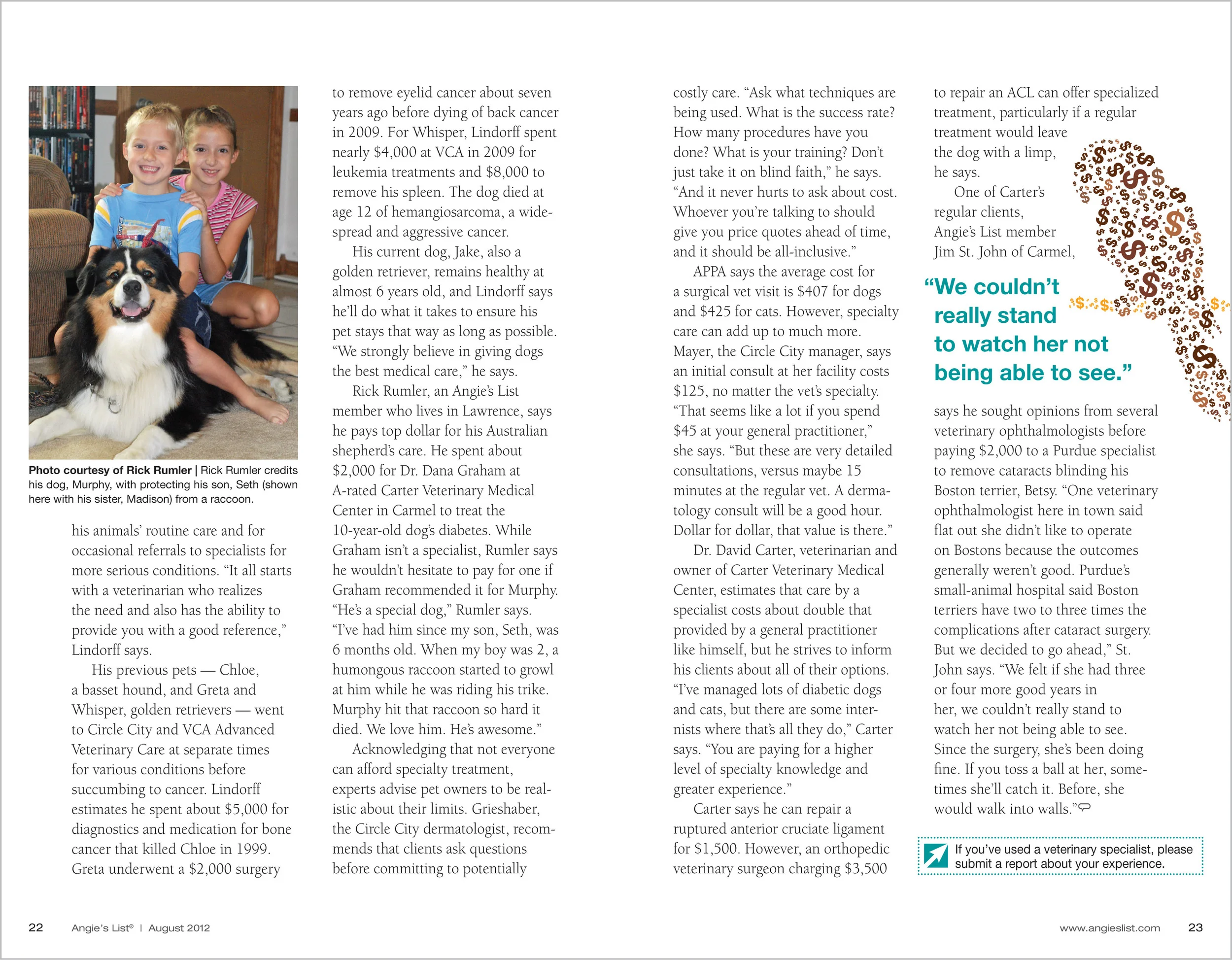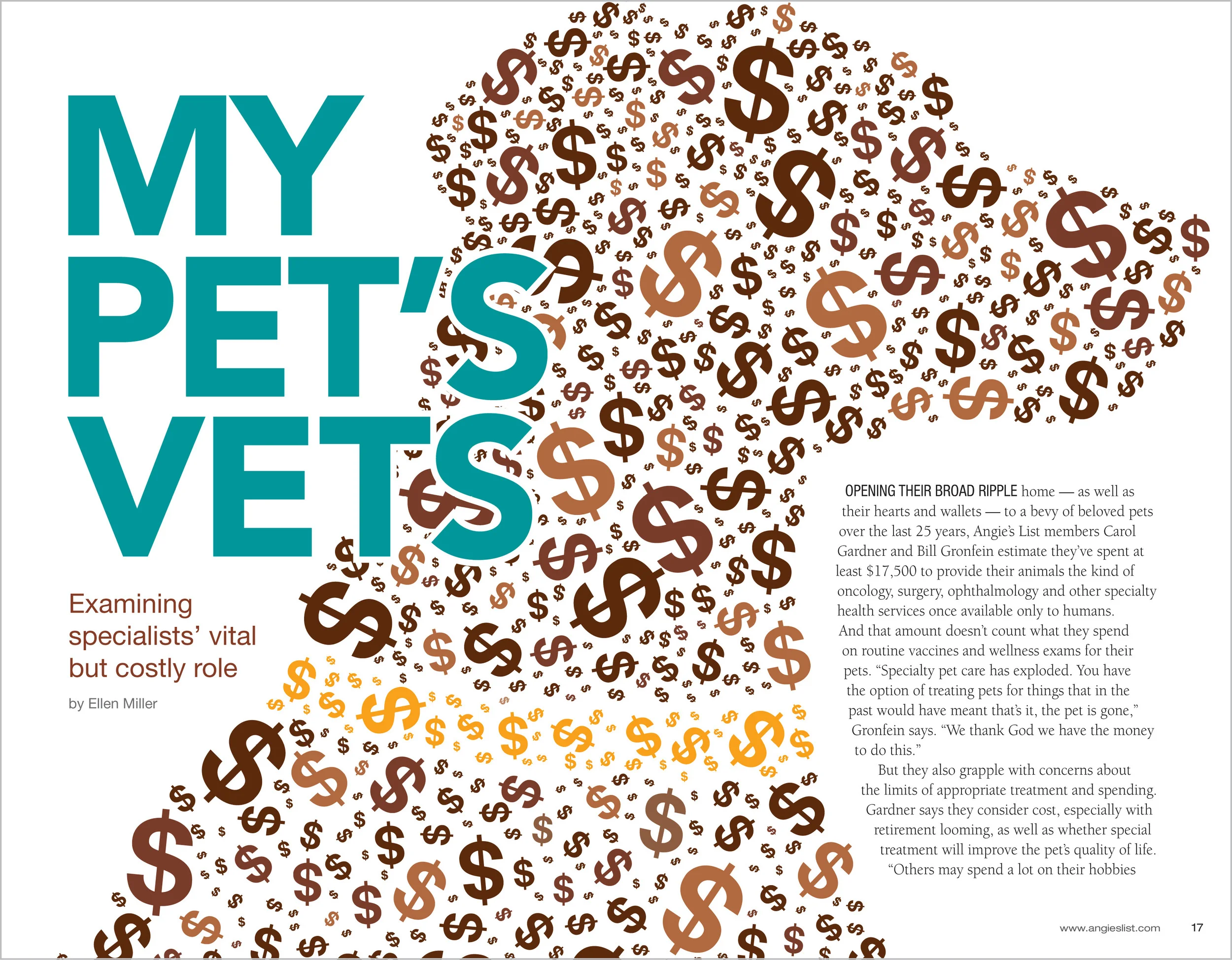 This story is about the high cost of specialty veterinarians for your pet. After doing several initial layouts for the opening spread, the idea struck me to make a dog out of dollar signs. The theme carries throughout with other critters as well.