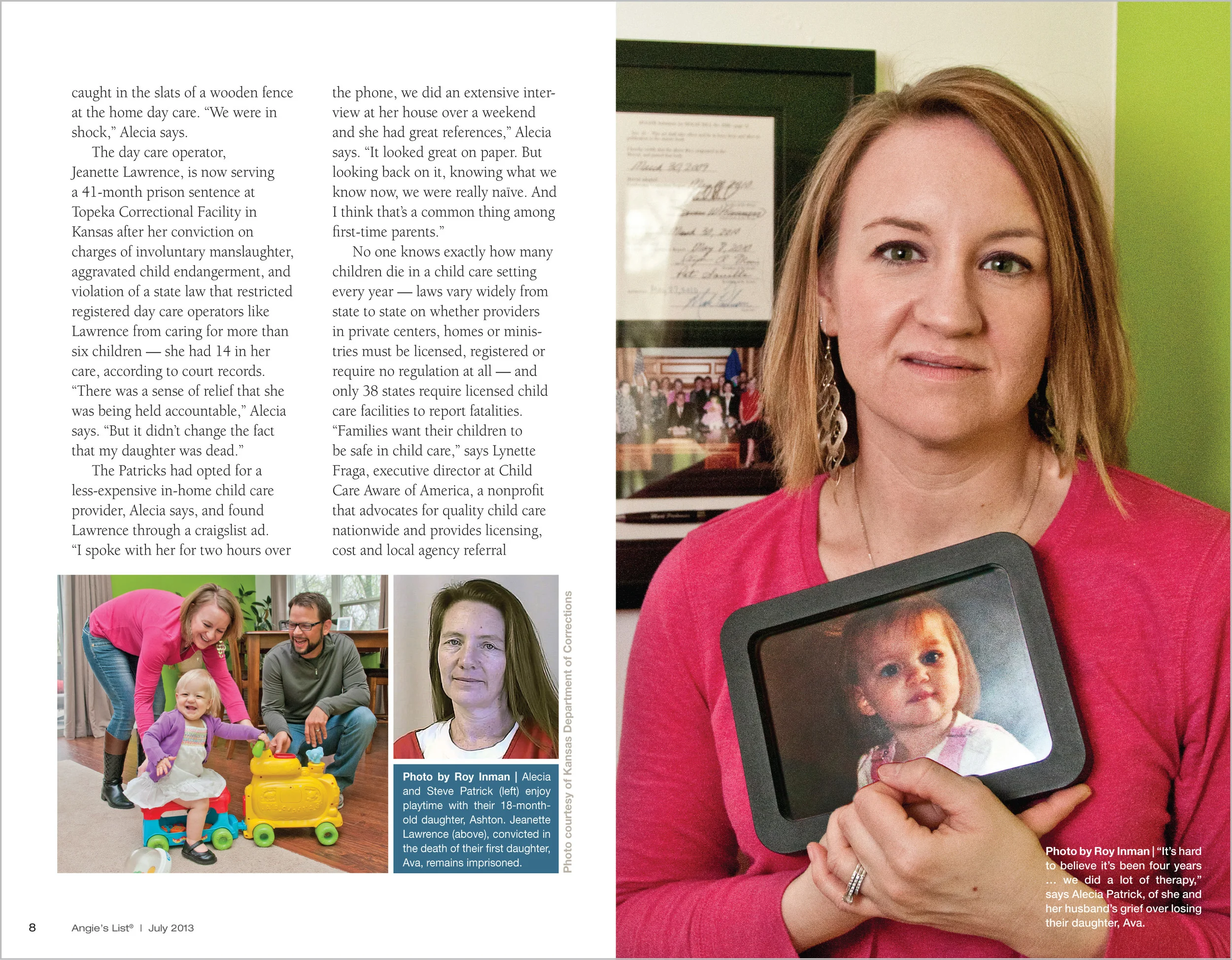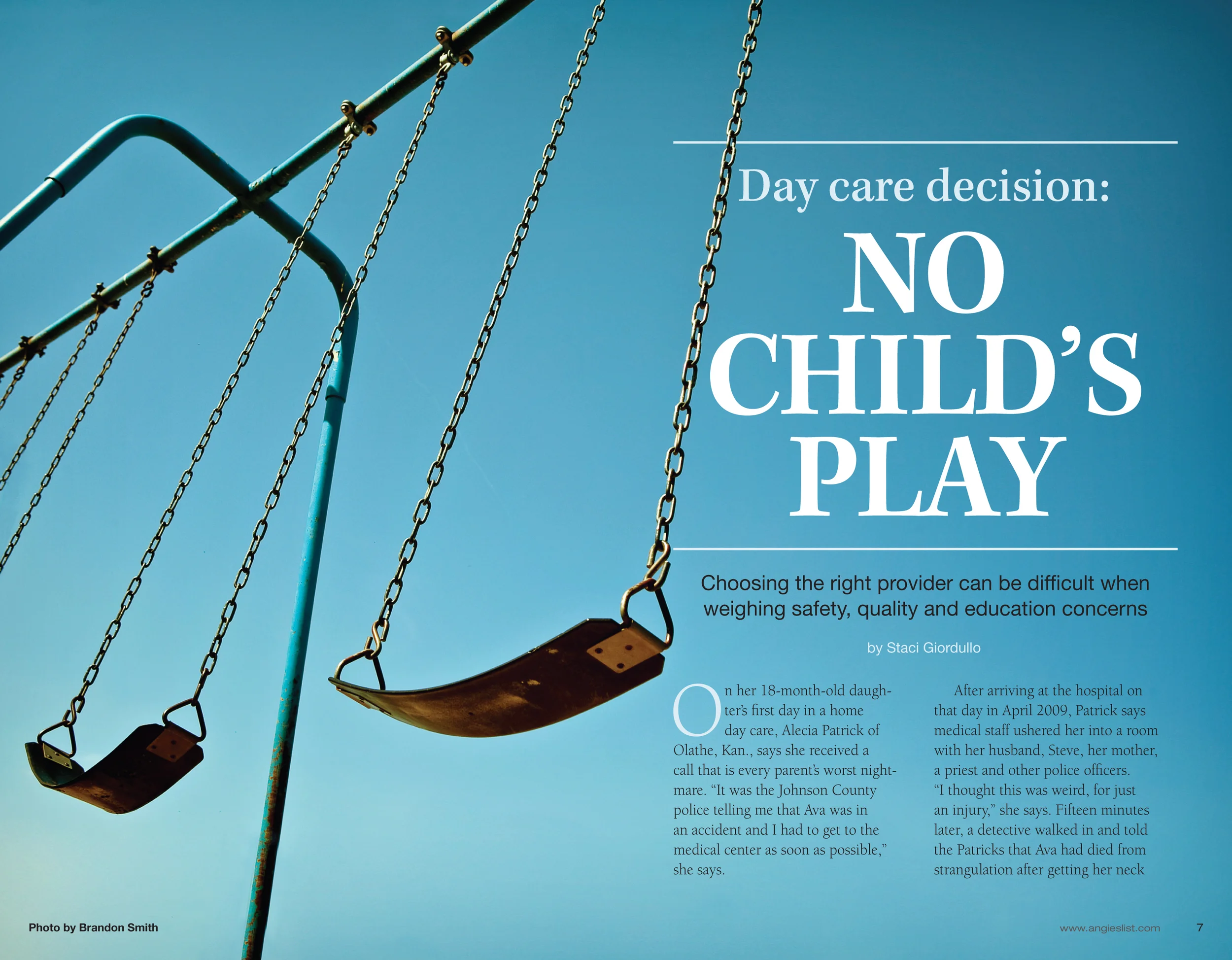 This story includes tragic stories involving child care providers, and sheds light on this important matter. I worked with the staff Photo Editor to come up with an impactful opening image, which was then shot specifically for this story. The result is very dramatic.