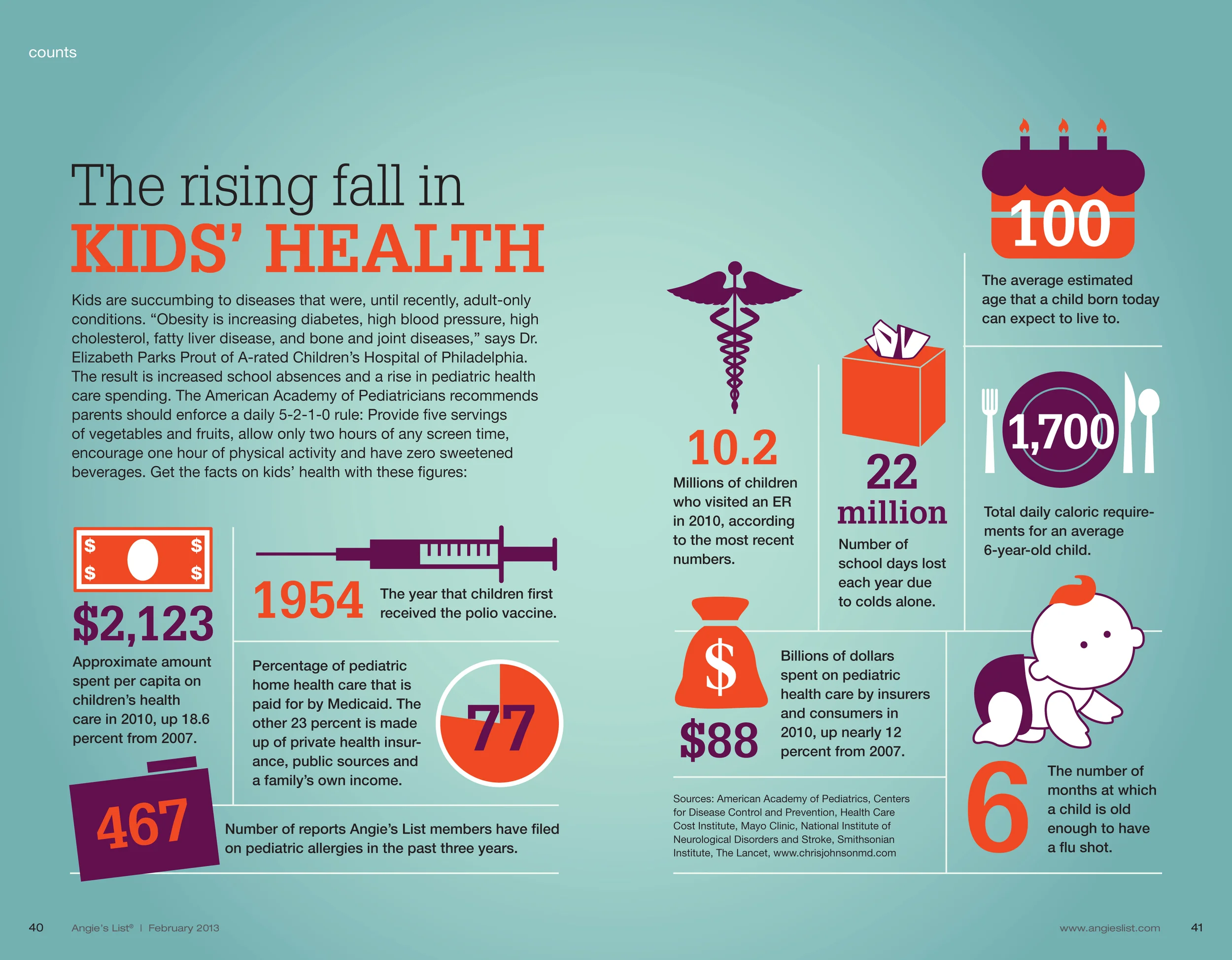 This story/infograph hybrid includes stats on kids' health issues. I designed all of the graphic elements as well.