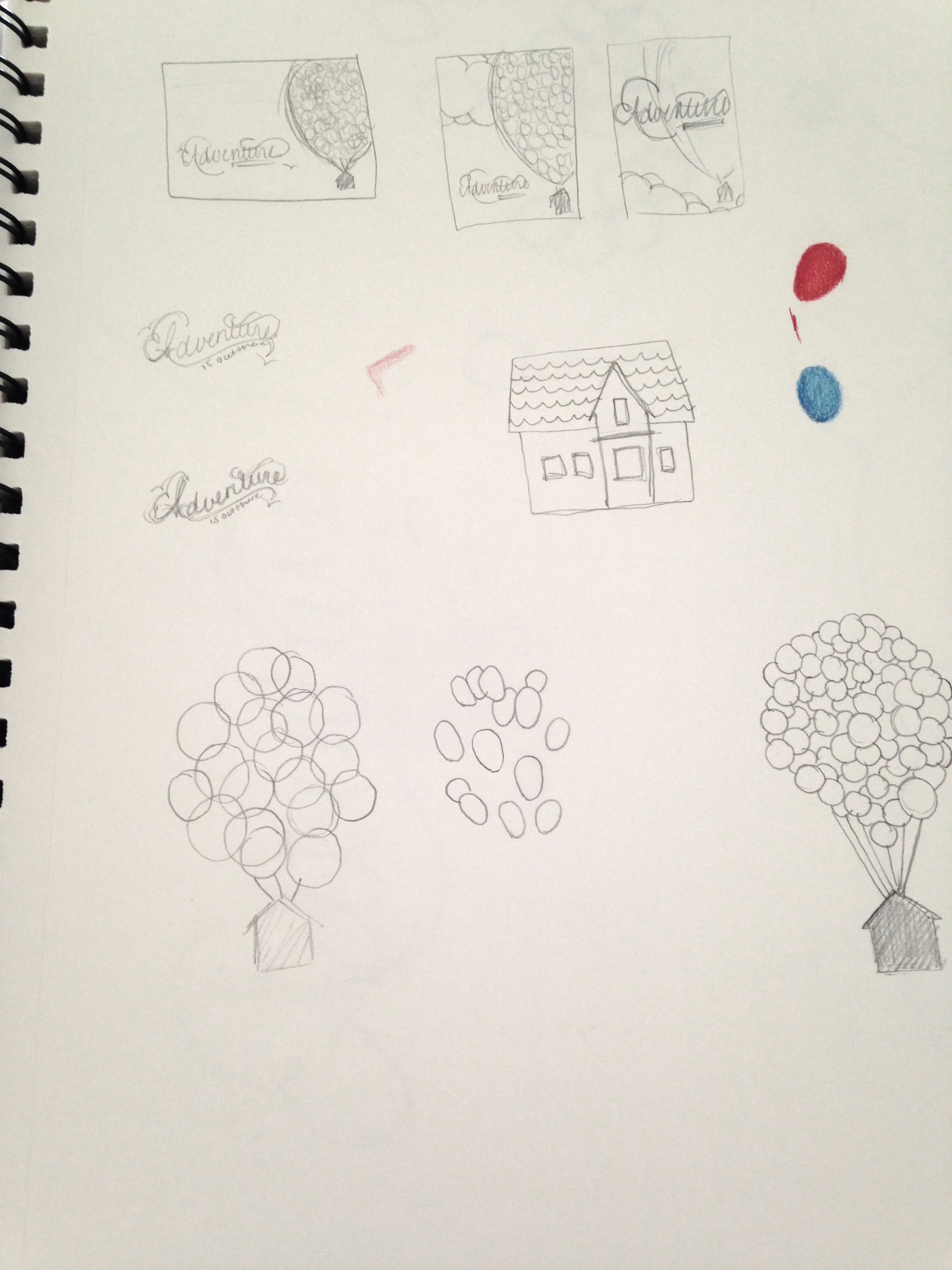 I did a LOT of sketching for this piece, because I was having a hard time coming up with something that made me go "this is it!" I found myself becoming easily intimidated by the balloons. I just wasn't sure how to go about them, and depending on the option I chose...well, I could end up with hundreds of balloons. And then I had an internal debate over the house. Do I make it look like the house in "Up"? Or just any house? Or a really simple stylized house? After considering all of my options, I decided on a very stylized version of the house and balloons.